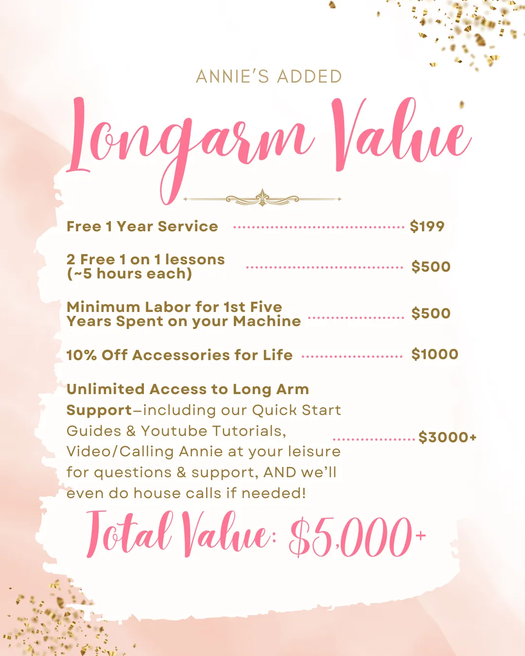 - You'll get access to all of our Longarm Resources, such as our QuickStart Guides, Youtube tutorials, and Annie's cell number to call/videochat for questions/troubleshooting!